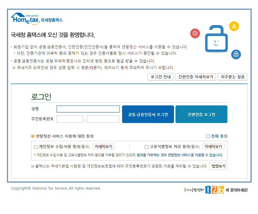 1) 국세청 홈택스 사이트에 접속하여 성명, 주민등록번호 입력 후 본인의 인증서나 간편 인증으로 로그인합니다.